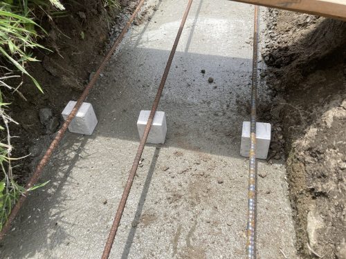 フーチング部分の配筋。まずはベースとなる配筋をします。スペーサーで被り厚を確保します。