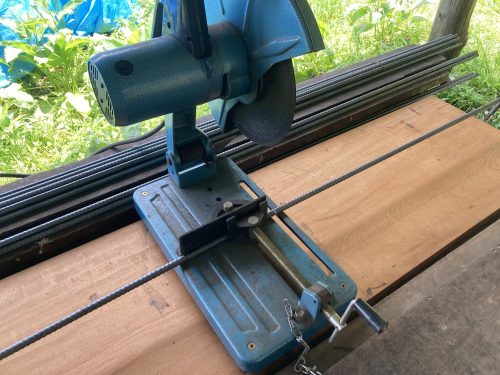 まずは、買ってきた鉄筋を既定の長さに高速切断機でカットします。