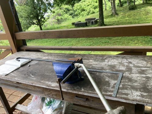 立ち上がり鉄筋のフックはベンダーで45°程度曲げた後、万力で180°につぶしました。