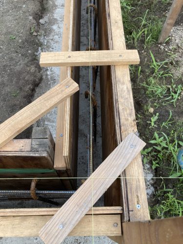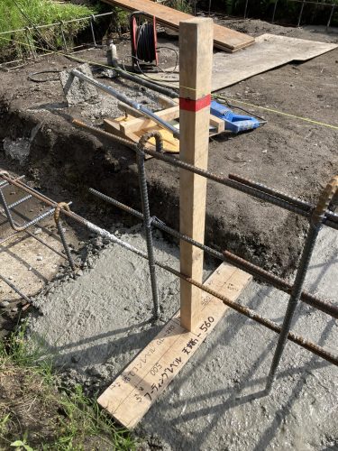 そして、現在は型枠工事が終わり、天端マーカー、アンカーボルト、丸セパ、Pコンなどの取り付け作業に入る段階です。