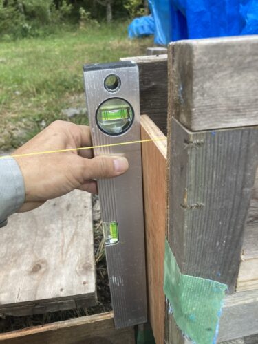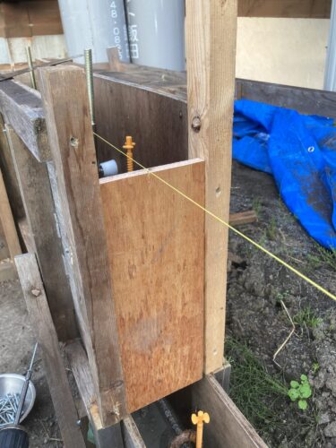 木枠が高くなったので、苦し紛れに水糸の通る溝を掘りました。