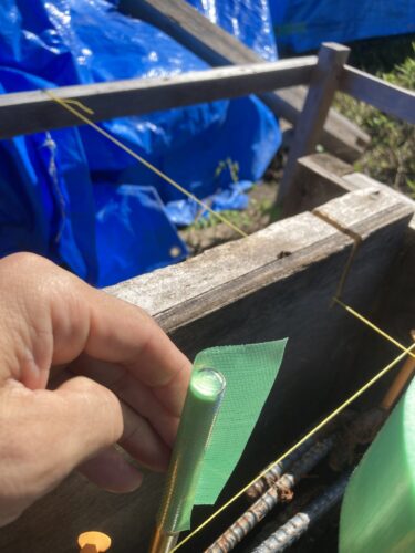 コンクリート打設前に水糸外して、溝を養生テープで塞ぎます。