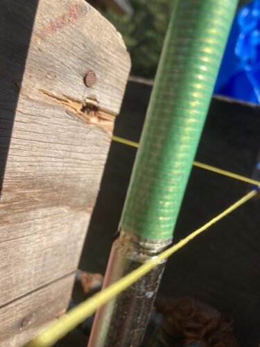 次は、内側と外側に杭と突っ張り棒でさらに木枠が広がらないように固定します。