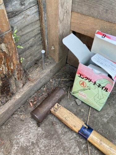 次に、型枠の下部分をコンクリートのフーティングにコンクリート釘で固定します。