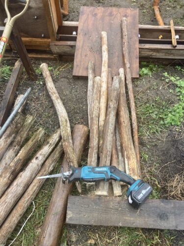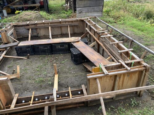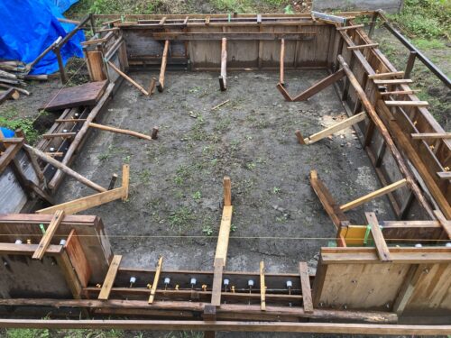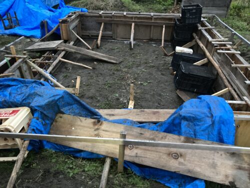 型枠を回りと内側から突っ張り棒で固定します。杭を打って固定します。