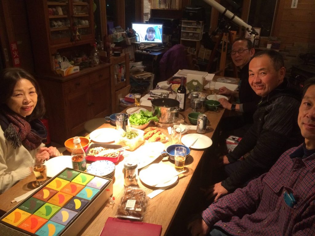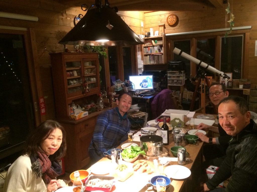 おいしい料理、飲み物をみんなで持ち寄り、ログハウス「カサビエント」で行われました。